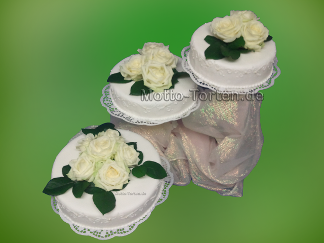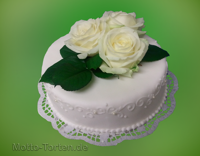 Ein Klassiker der immer wieder gerne genommen wird, echte Rosen auf der Torte, passend zum Brautstrauß und der restlichen Deko.